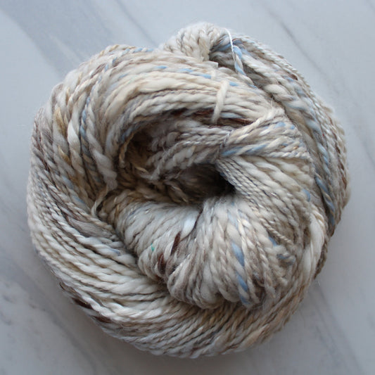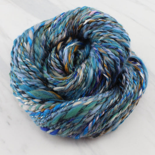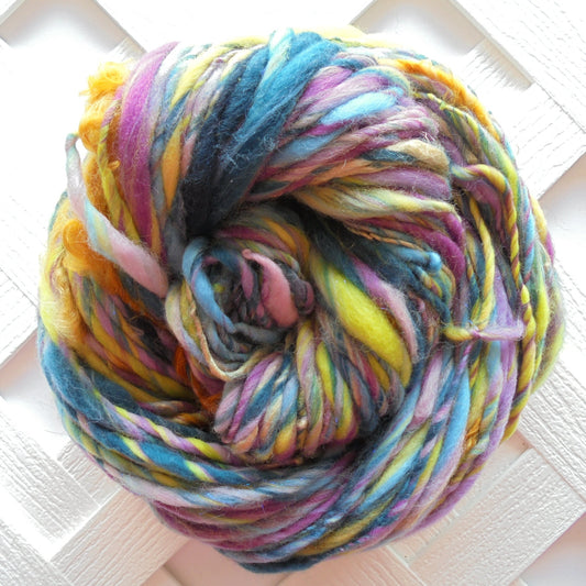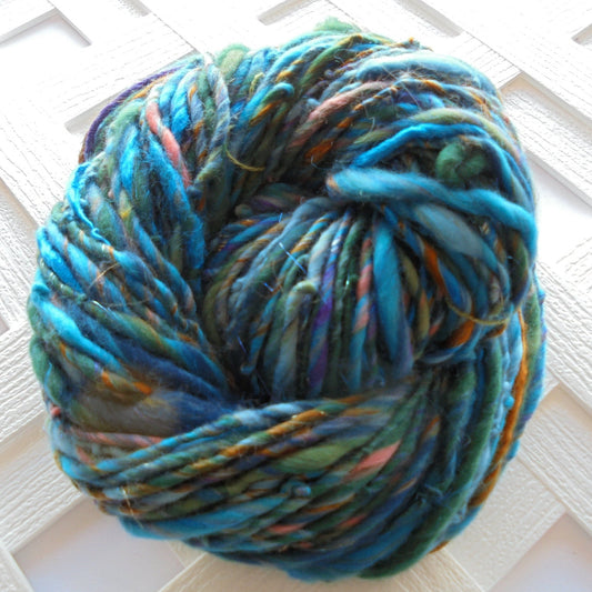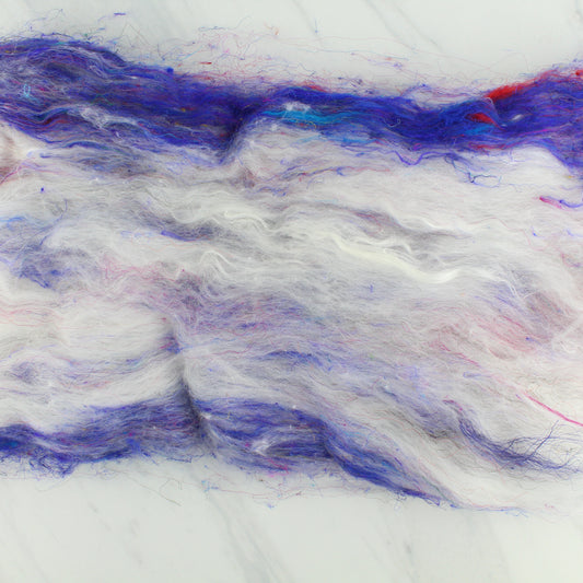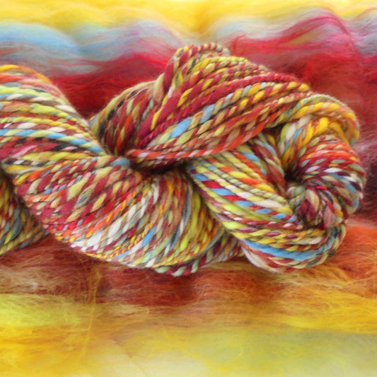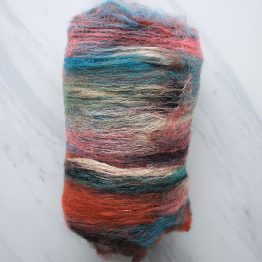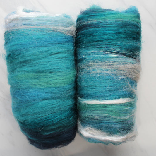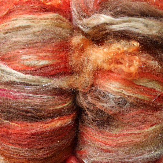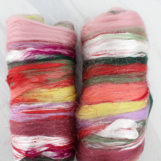 The art batts make it easy to make your own art yarn. I use a multitude of soft natural fibers like merino, Polwarth, baby alpaca, baby camel down, kid mohair locks, Teeswater locks, and several kinds of silk. You have the option of adding a little angelina and firestar for a bit of shimmer. Every one is great to spin, and most are great for felting too. Take a look at the amount of feltable fiber just to be sure.