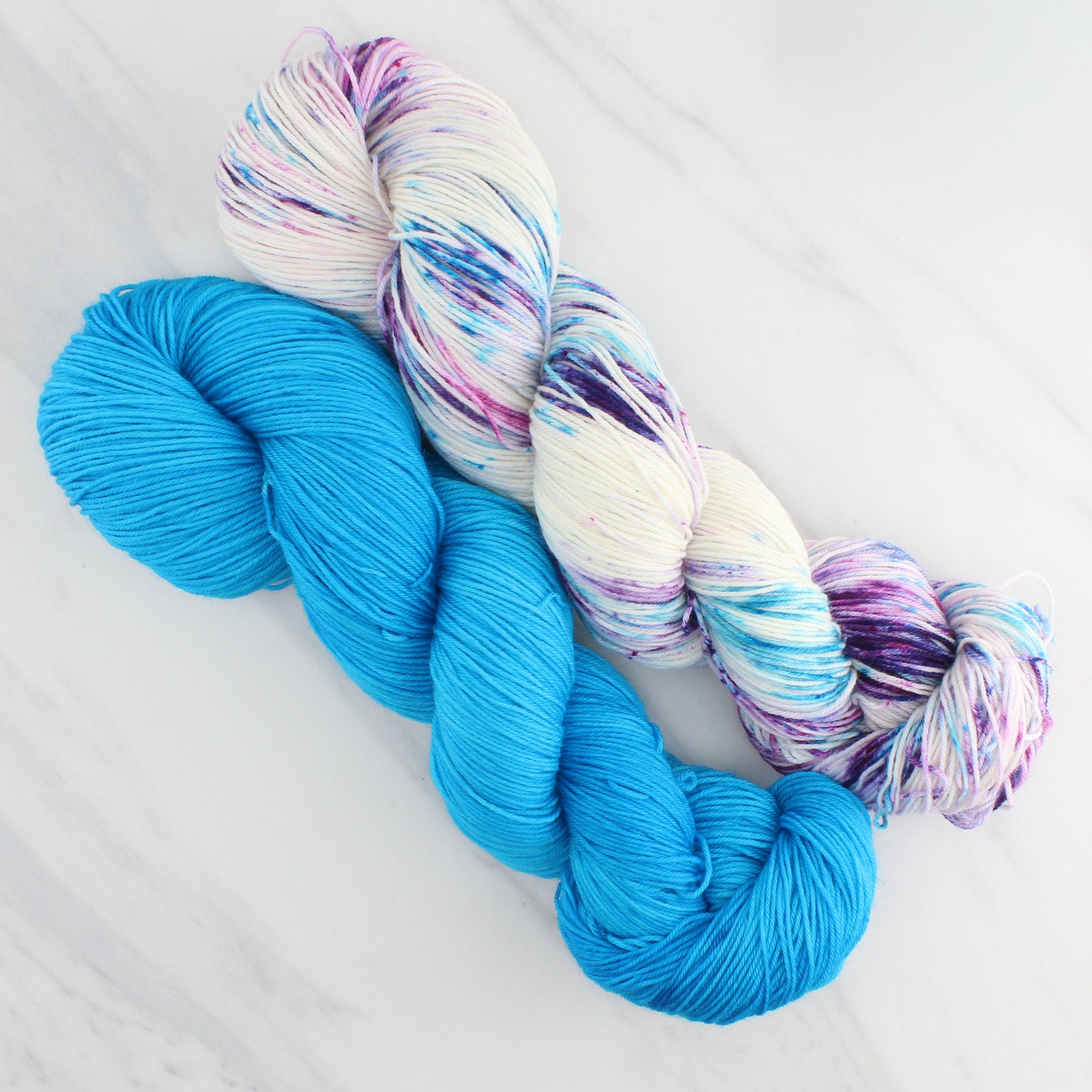 Splashed & Speckled Colorways - These colorways have multiple colors that are placed over the skein in short segments of no more than an inch or two at a time. They often have speckles as well, which are small dots of dye. Because of the varied placement of the dyes, each skein tends to vary more than with other colorway types. Splashed & Speckled colorways are not likely to pool.