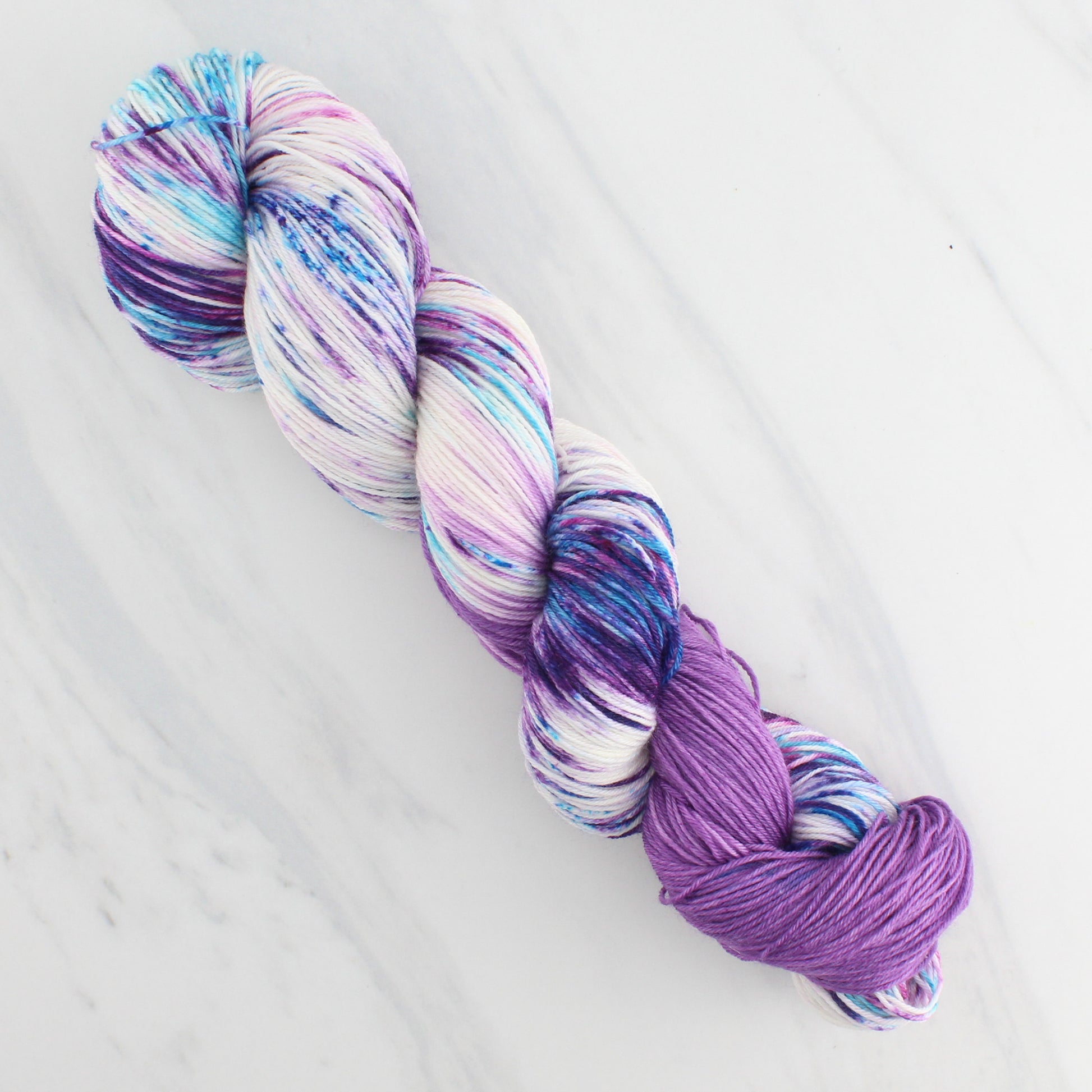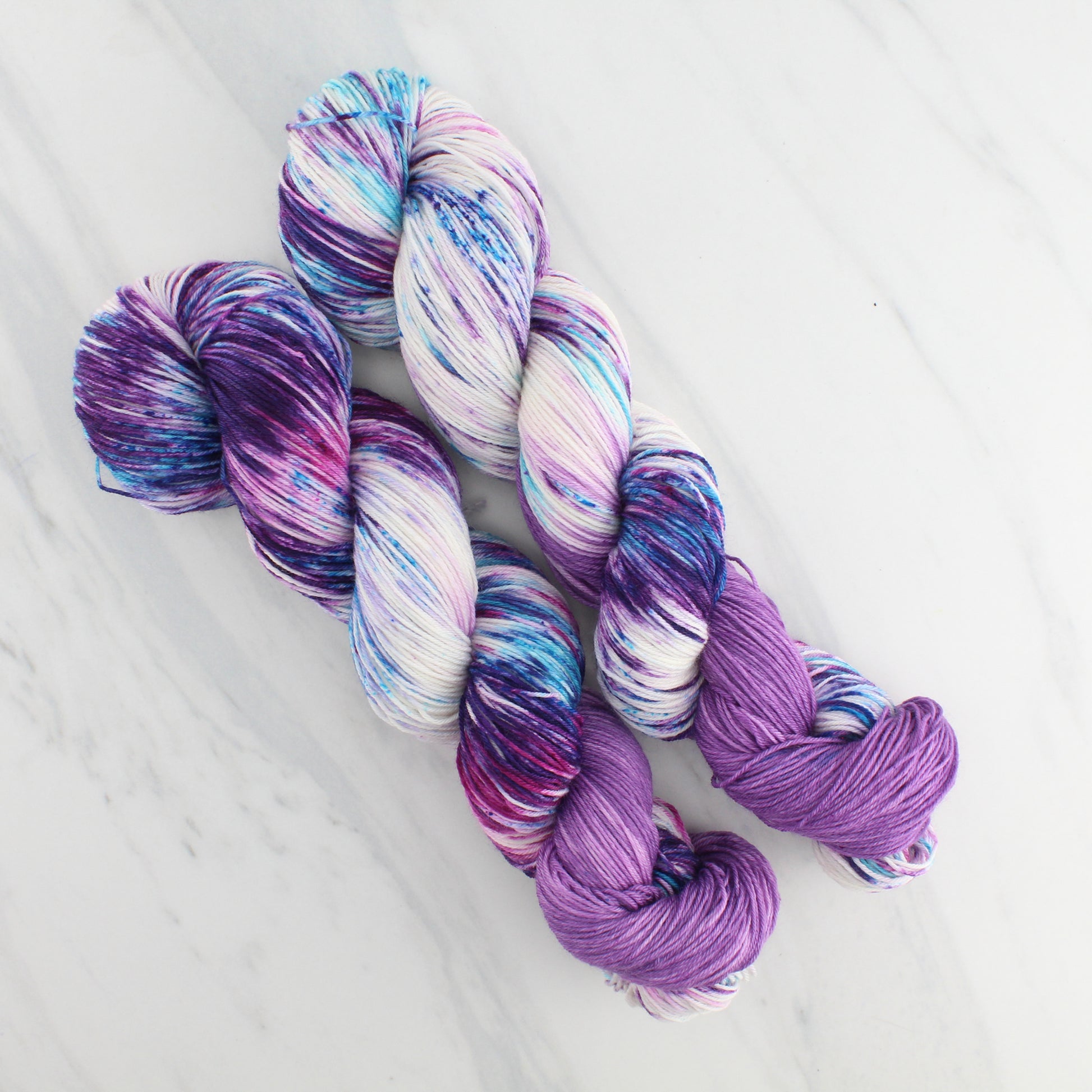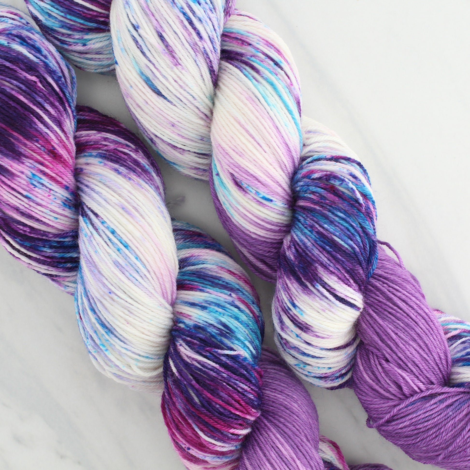 Splashed & Speckled Colorways - These colorways have multiple colors that are placed over the skein in short segments of no more than an inch or two at a time. They often have speckles as well, which are small dots of dye. Because of the varied placement of the dyes, each skein tends to vary more than with other colorway types. Splashed & Speckled colorways are not likely to pool.