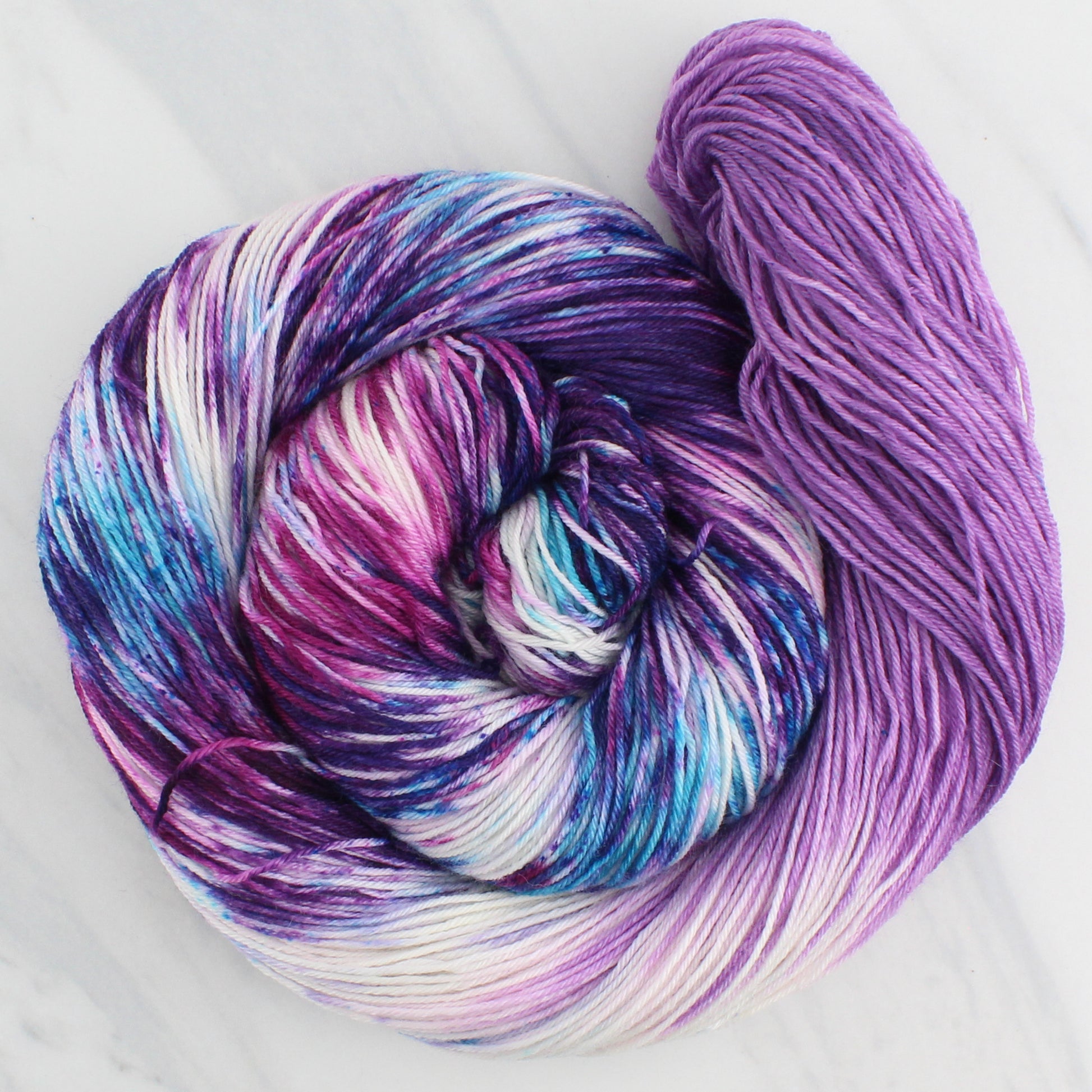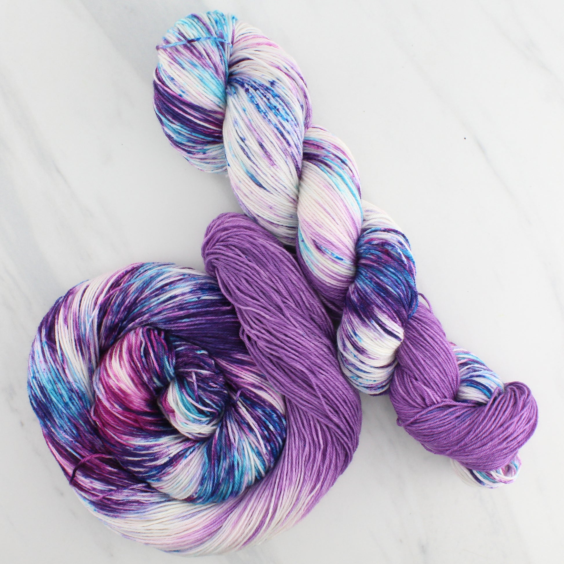 I dyed a quarter of the skein in Eggplant and the rest of it in splashes of Burgundy Rose, Renaissance Blue, Lilac, and Eggplant.