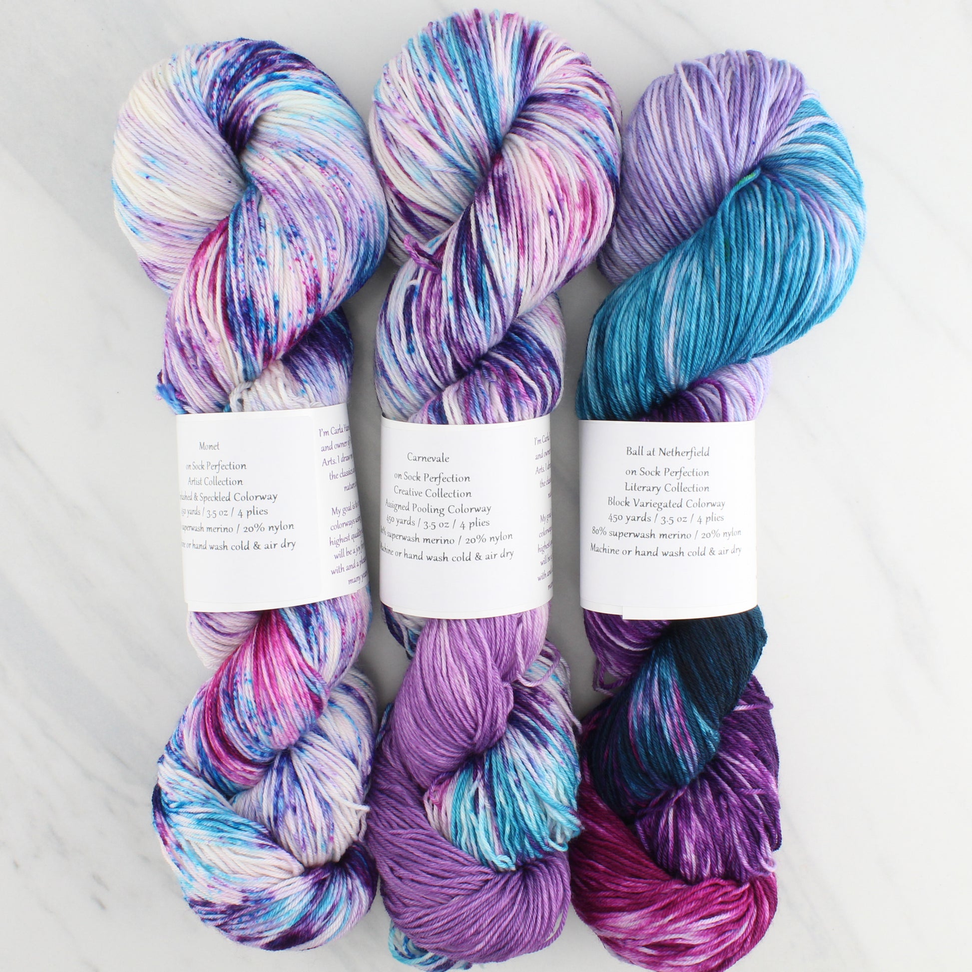 Planned Pooling Colorways - Planned pooling colorways are a type of block variegated colorway with between 2 and 5 colors that can be used for planned pooling projects like those Mary Bird offers for crochet in her book, Yarn Pooling Made Easy, and Laura Bryant offers for knitting in her book, Artful Color, Mindful Knits. These create really cool effects, but they take some patience and experimenting.