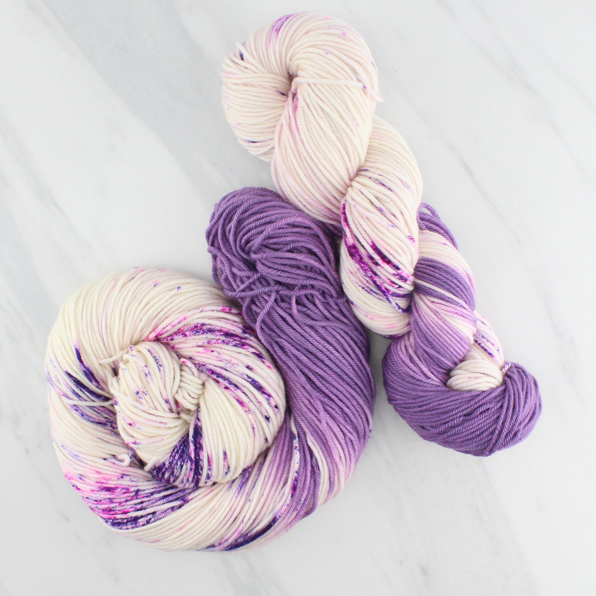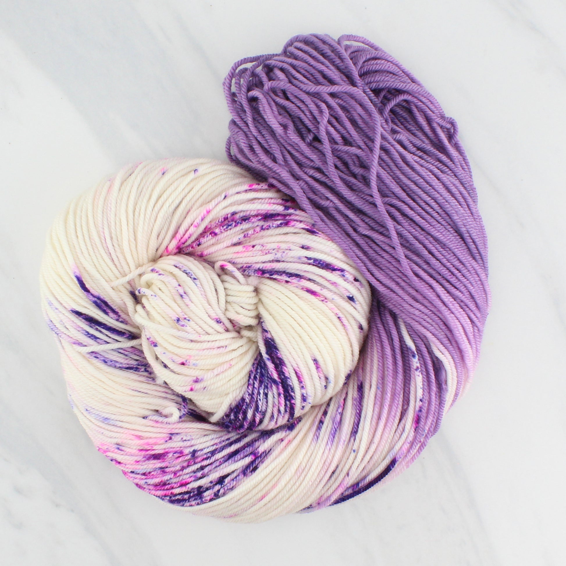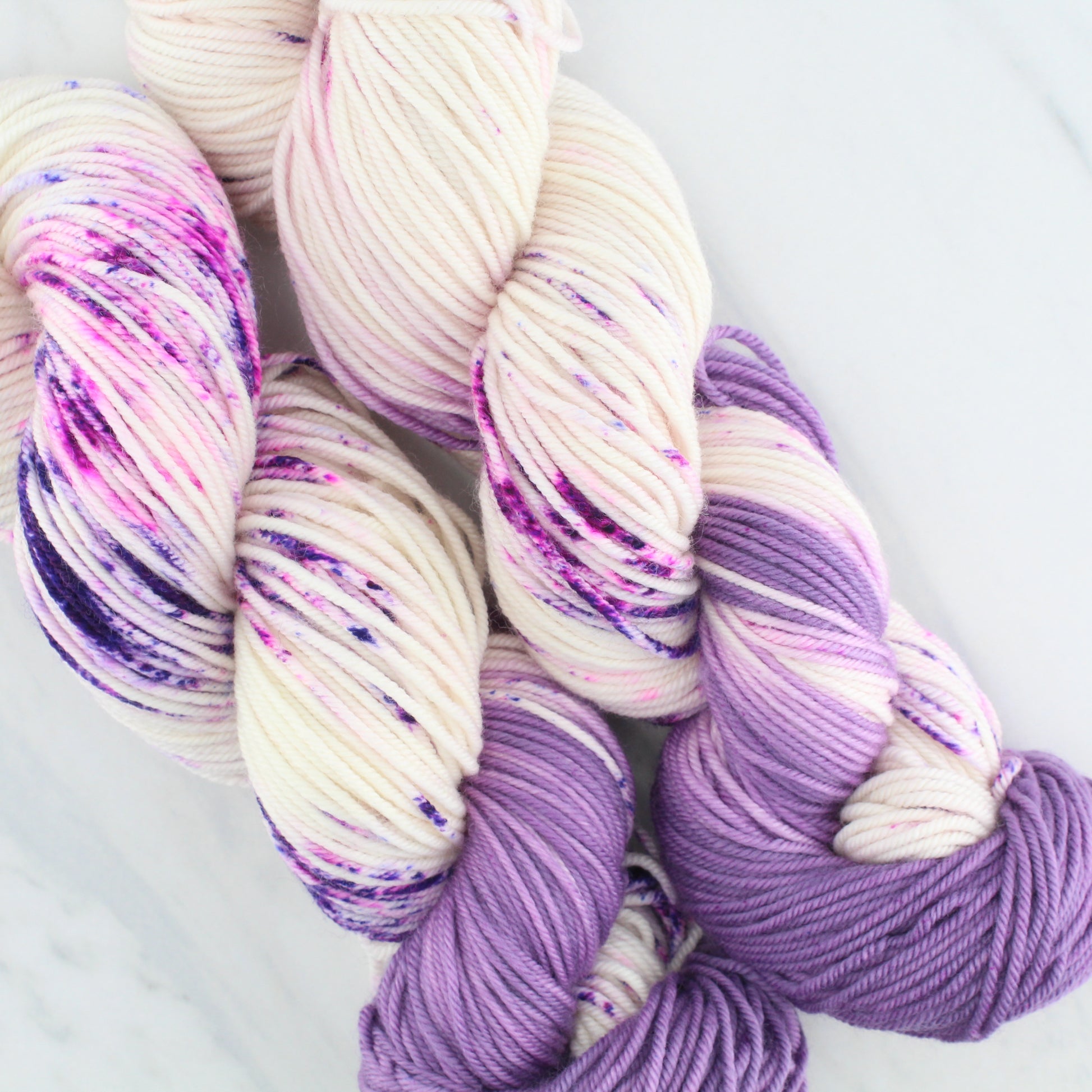 Crocuses in Snow was inspired by the idea of the first flowers of spring poking their lovely purple and pink heads out through the snow, announcing the very beginning of spring and all the hope that comes with it. This is an assigned pooling colorway with purple at one end and white with speckles for the rest of the skein.