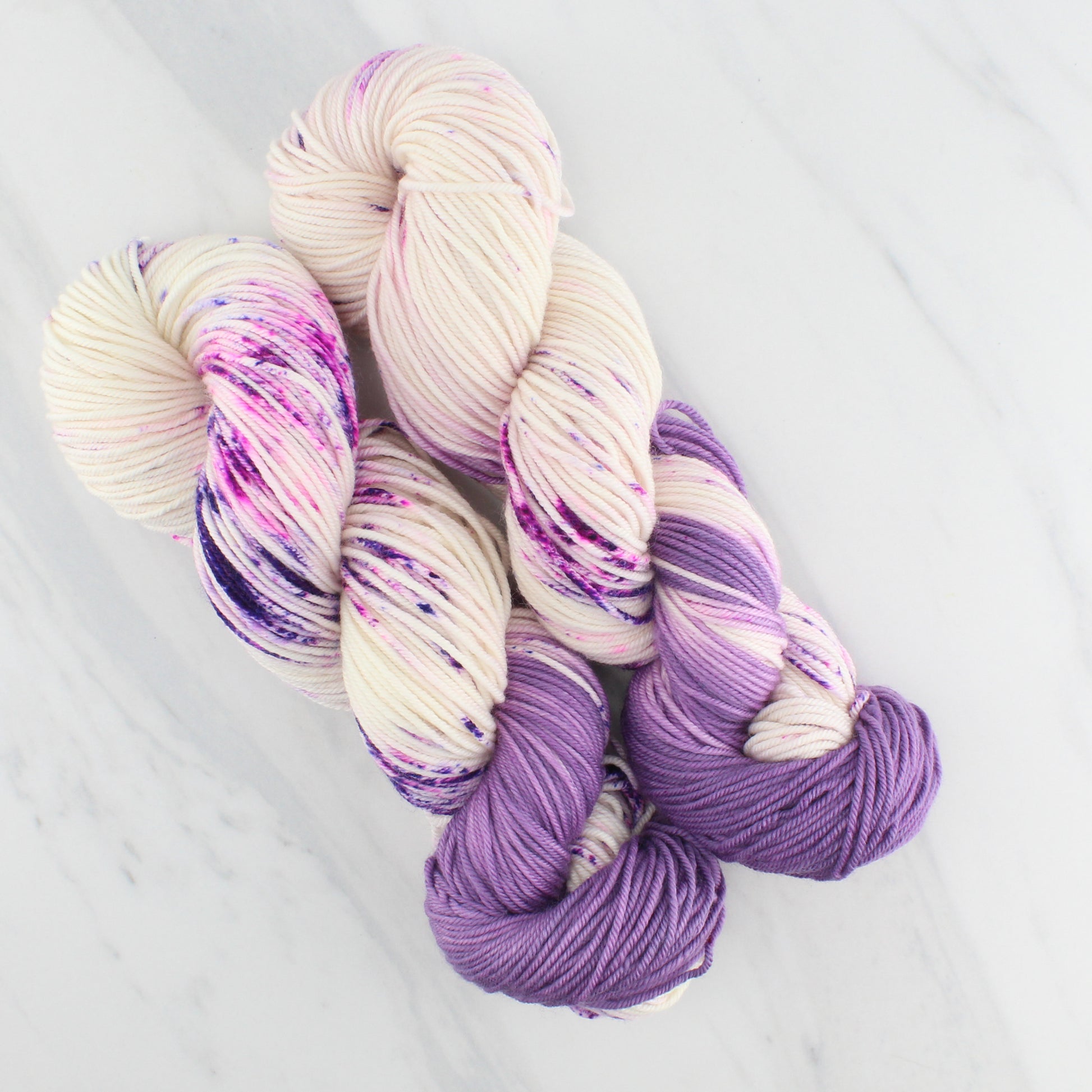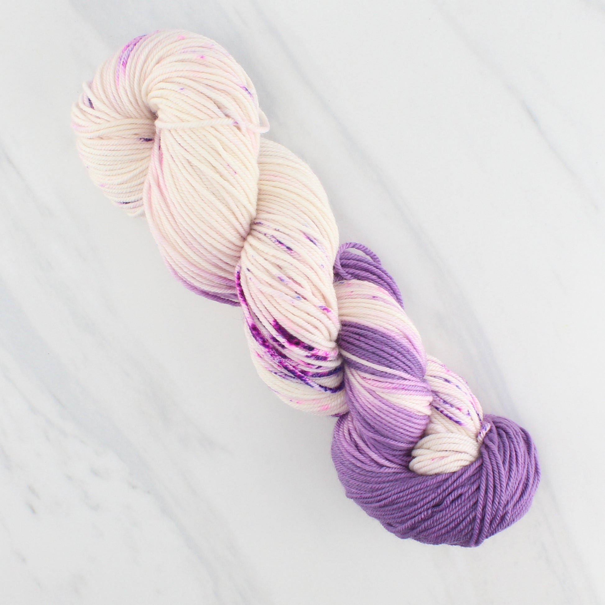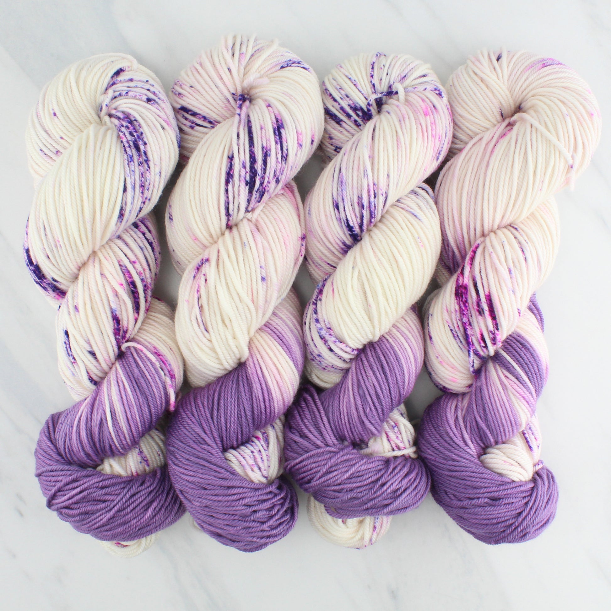 Crocuses in Snow was inspired by the idea of the first flowers of spring poking their lovely purple and pink heads out through the snow, announcing the very beginning of spring and all the hope that comes with it. This is an assigned pooling colorway with purple at one end and white with speckles for the rest of the skein.