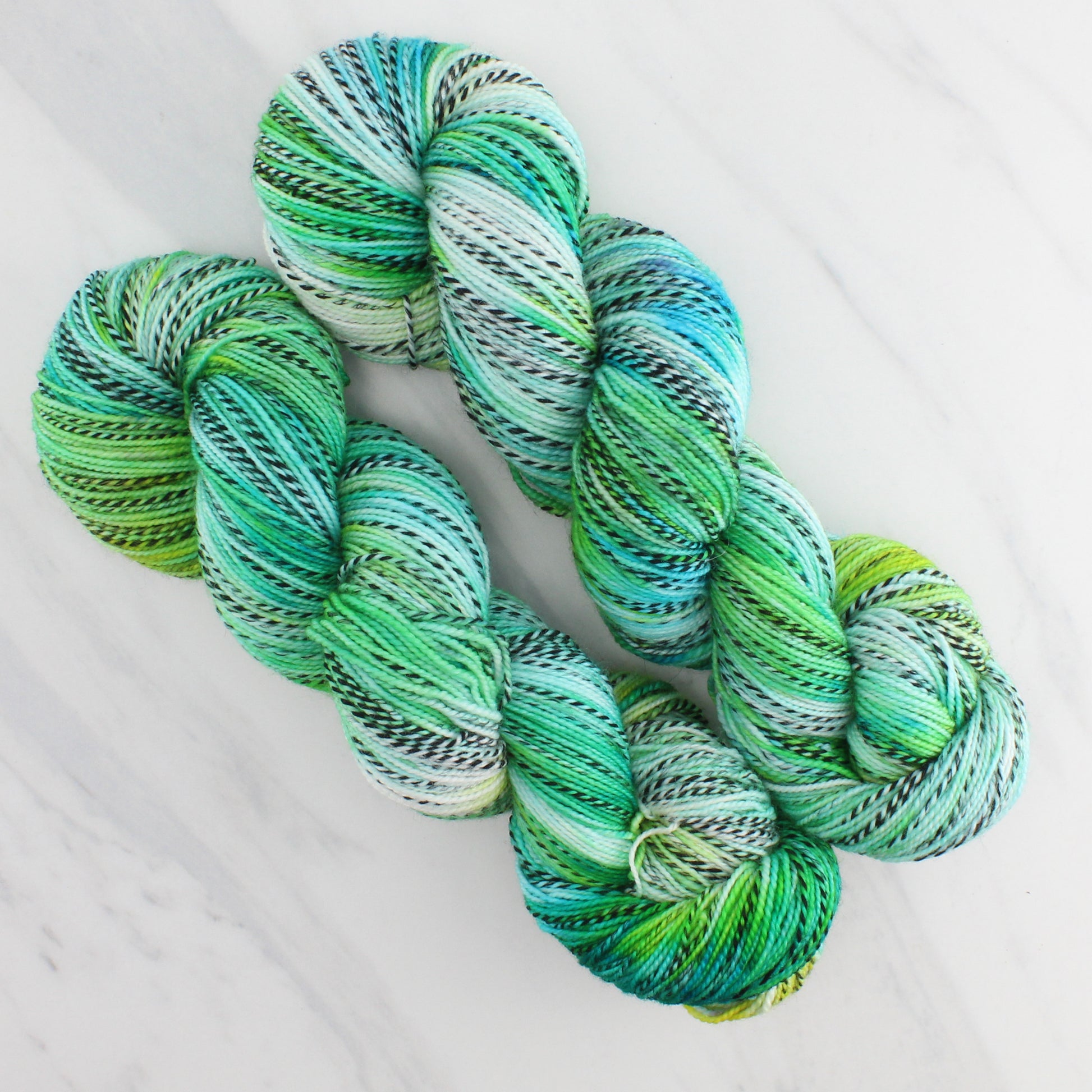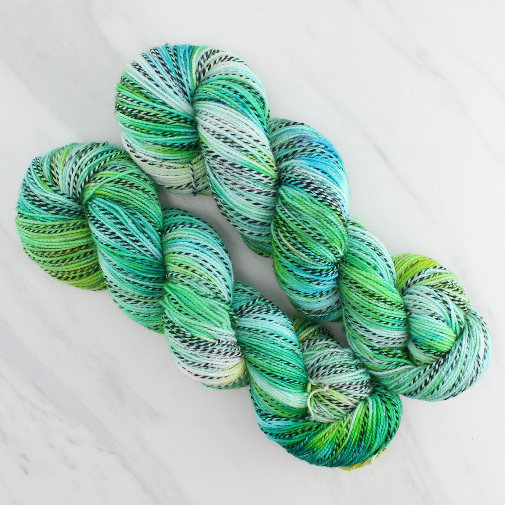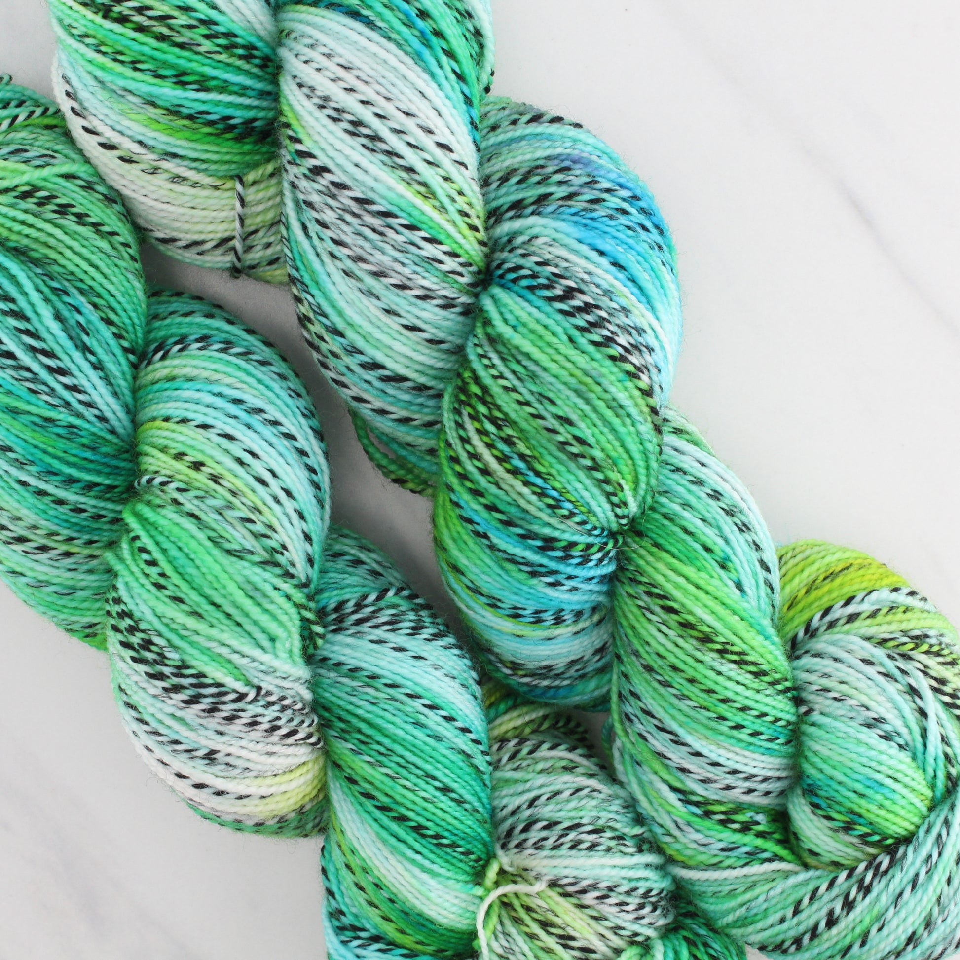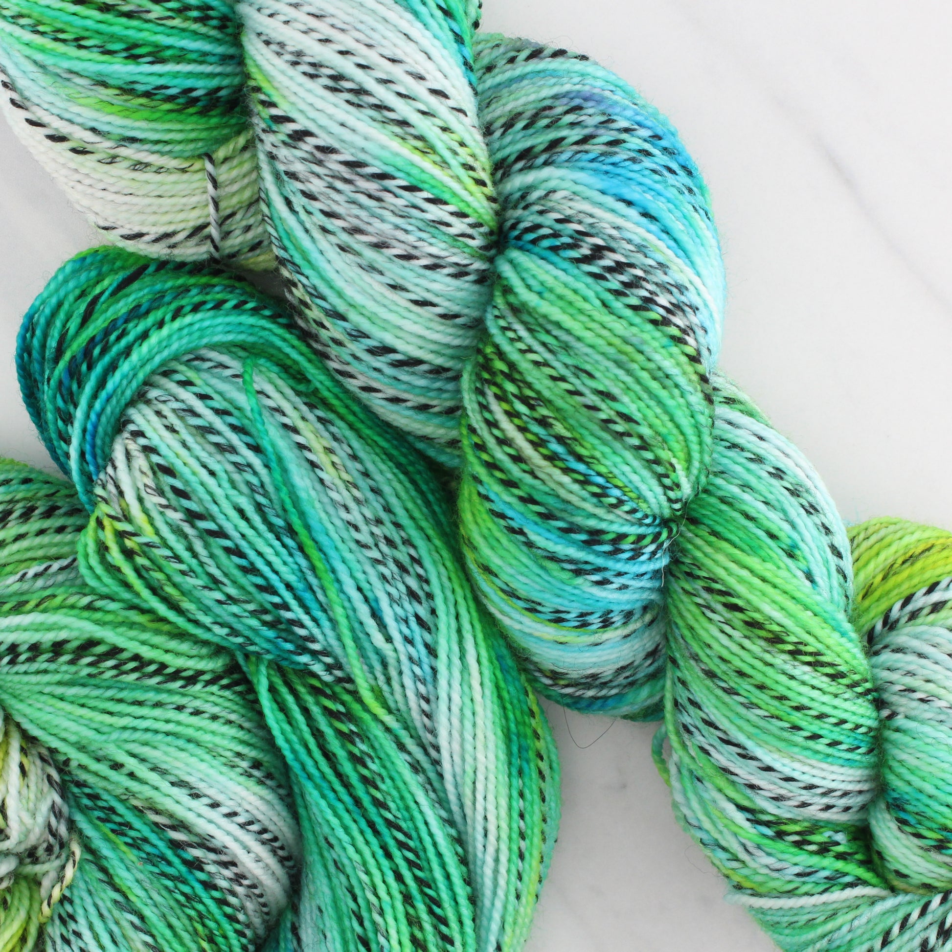 I dyed this colorway on Stained Glass Sock, which is a soft and squishy 2-ply yarn made of 80% superwash merino and 20% nylon. The thing that makes Stained Glass Sock uniquely wonderful is that one ply is made of white wool while the other alternates between black and white, so when I dye the yarn, it looks like leaded stained glass. Each 100 gram skein has 400 yards.