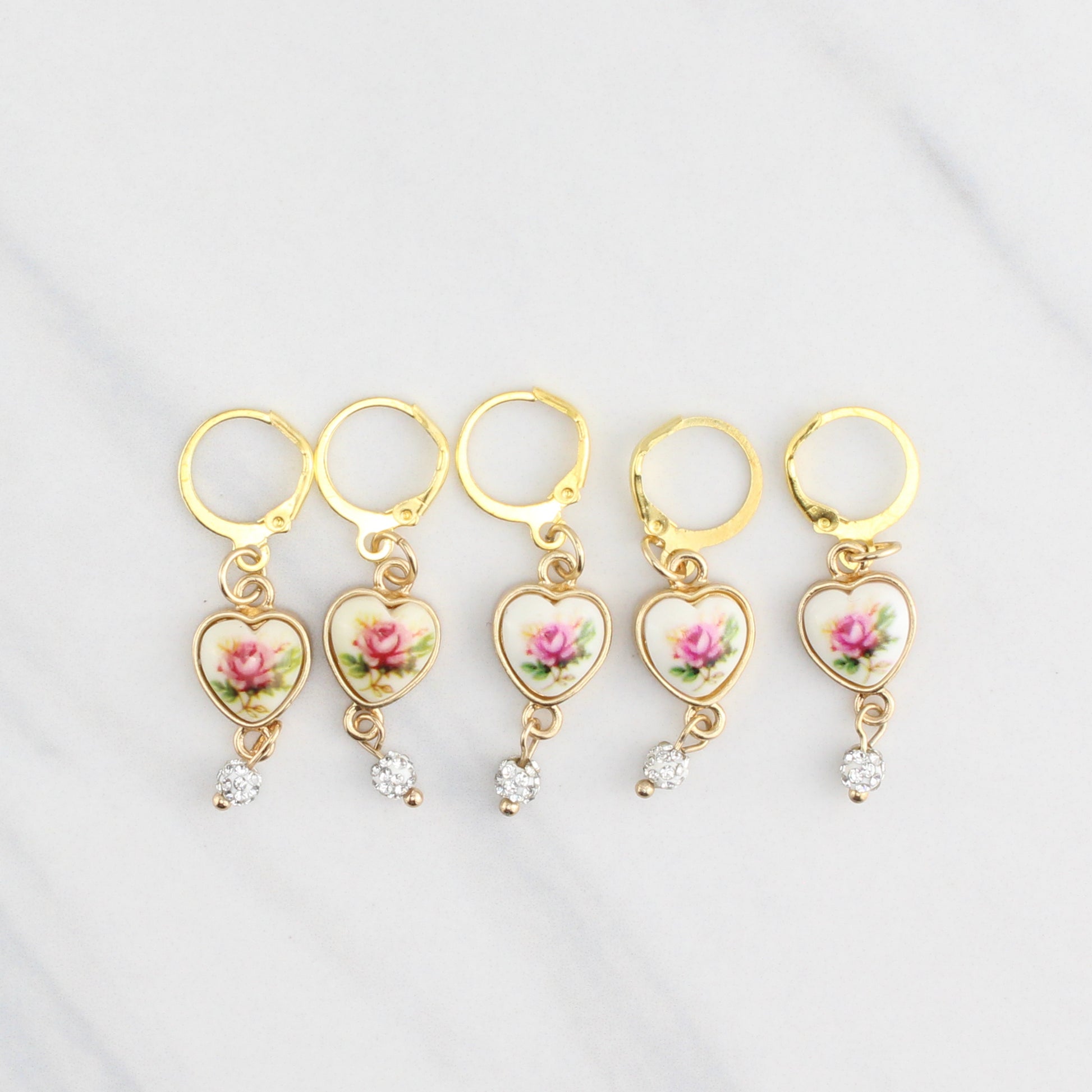 These beautiful stitch markers have delicate roses painted on heart-shaped ceramic with a little gem dangling at the bottom. They come in sets of 5 stitch markers.