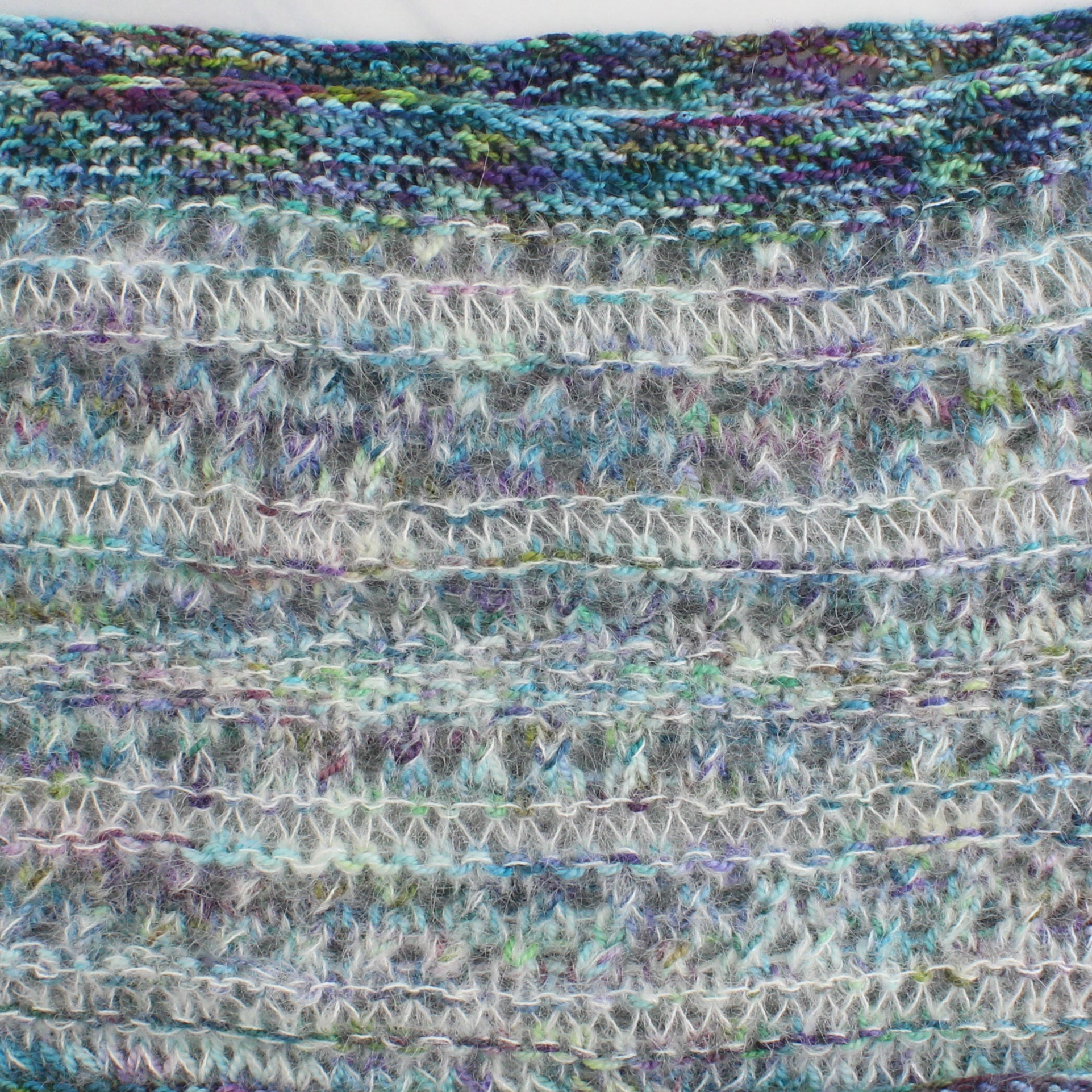The pattern uses a suri alpaca lace like my Suri Lace Cloud and a soft sock-weight yarn like my own So Silky Fingering, Dream Sock, or Sock Perfection. Most of the time, the two yarn bases are held together, but for some rounds you just use one or the other.