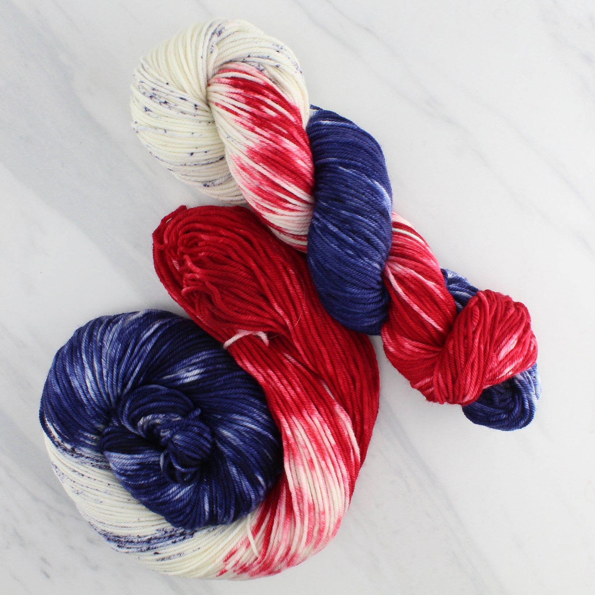 Liberty is a colorway I made to celebrate our beautiful country striving so much to live up to its ideals. It's made of Navy blue, a deep red I call Cherries Jubilee, and sections of white with Navy speckles.