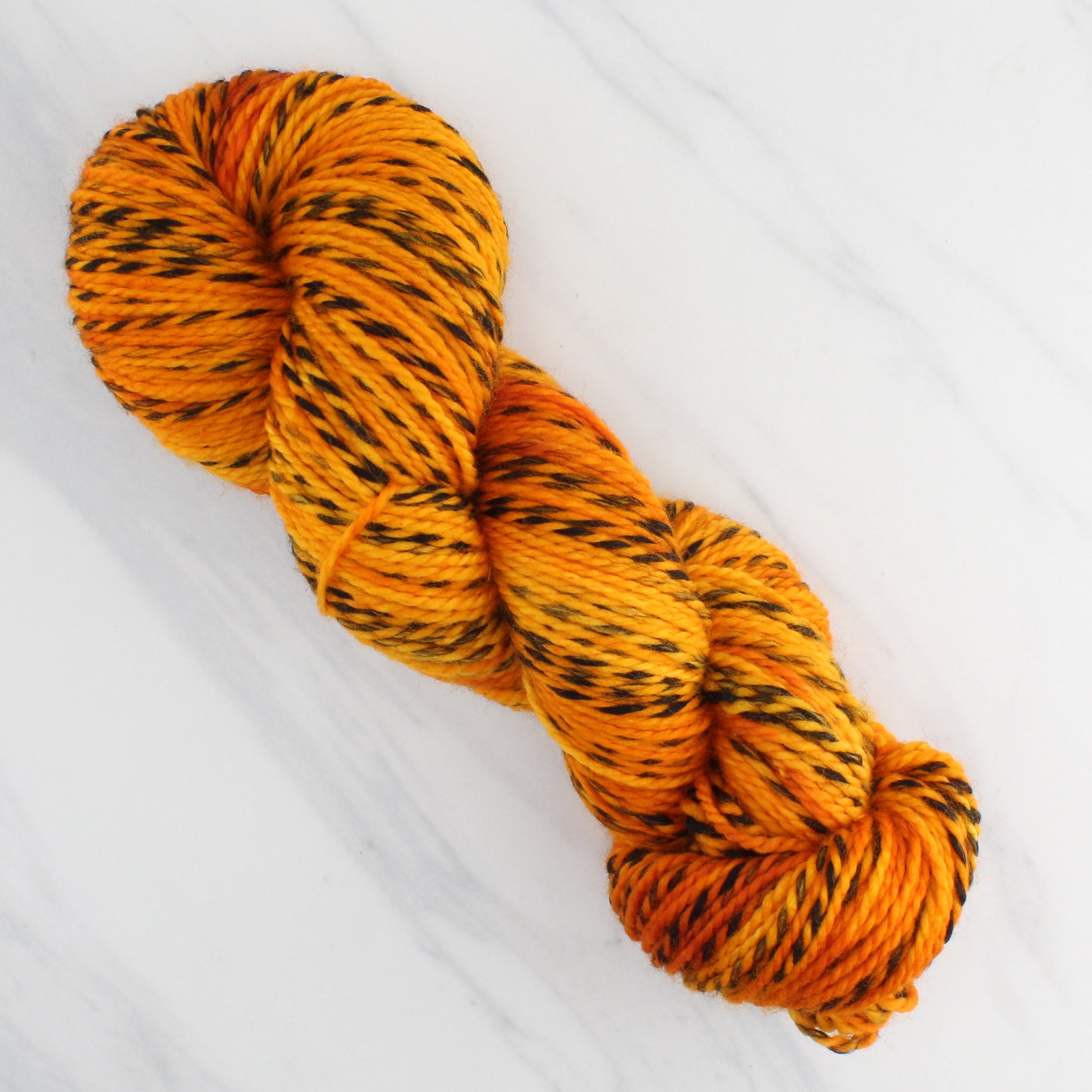 I dyed this colorway on Stained Glass DK, which is a wonderfully squishy 2-ply yarn made of 100% superwash merino. The thing that makes it uniquely wonderful is that one ply is made of white wool while the other alternates between black and white, so when I dye the yarn, it looks like leaded stained glass--or in this case the black lines in monarch butterflies' wings.
