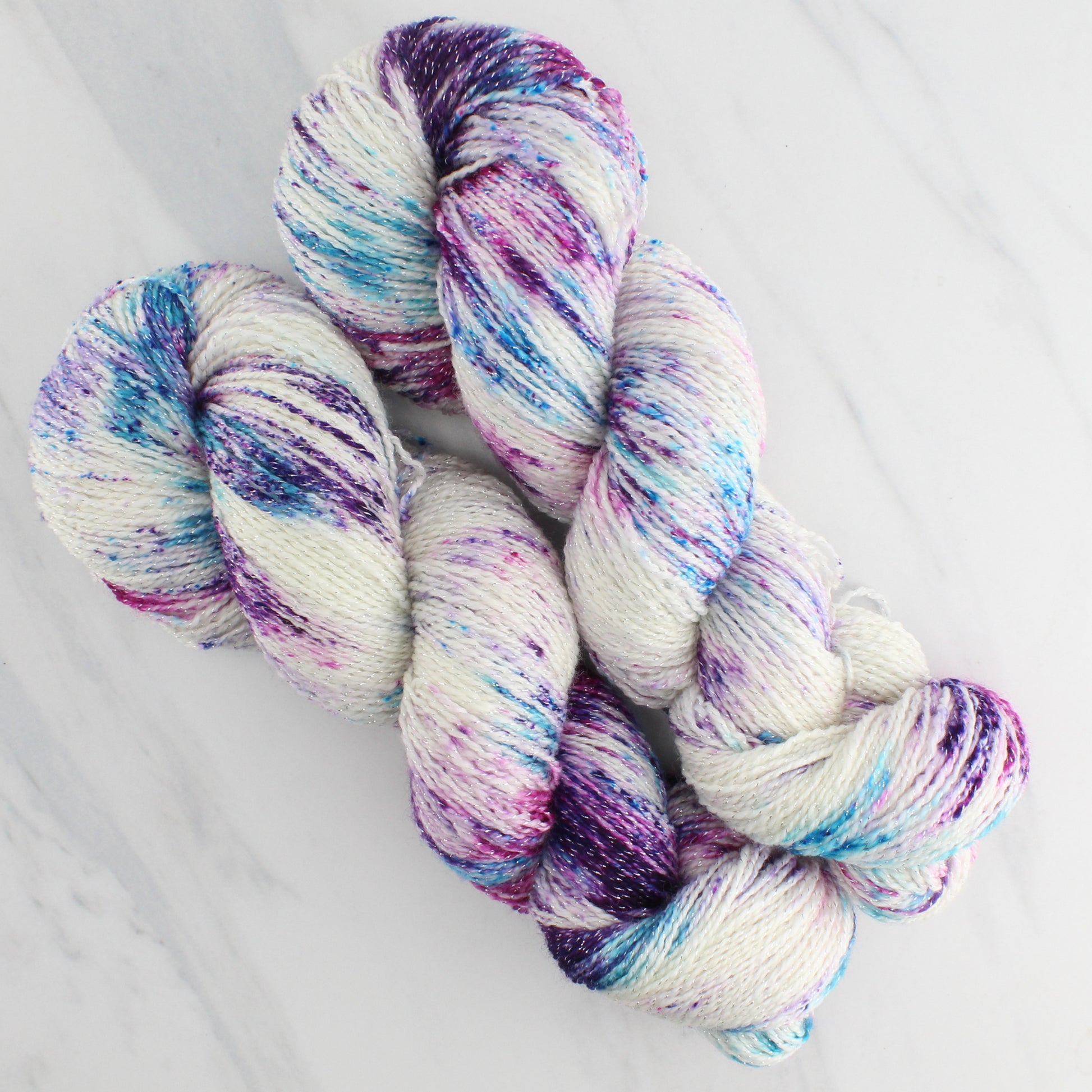 I dyed it on Twinkle Fingering, which is a soft 2-ply yarn made with 90% superwash merino and a 10% sparkly lurex. If you enlarge the pictures, the sparkle shows really well just as it does in real life.
