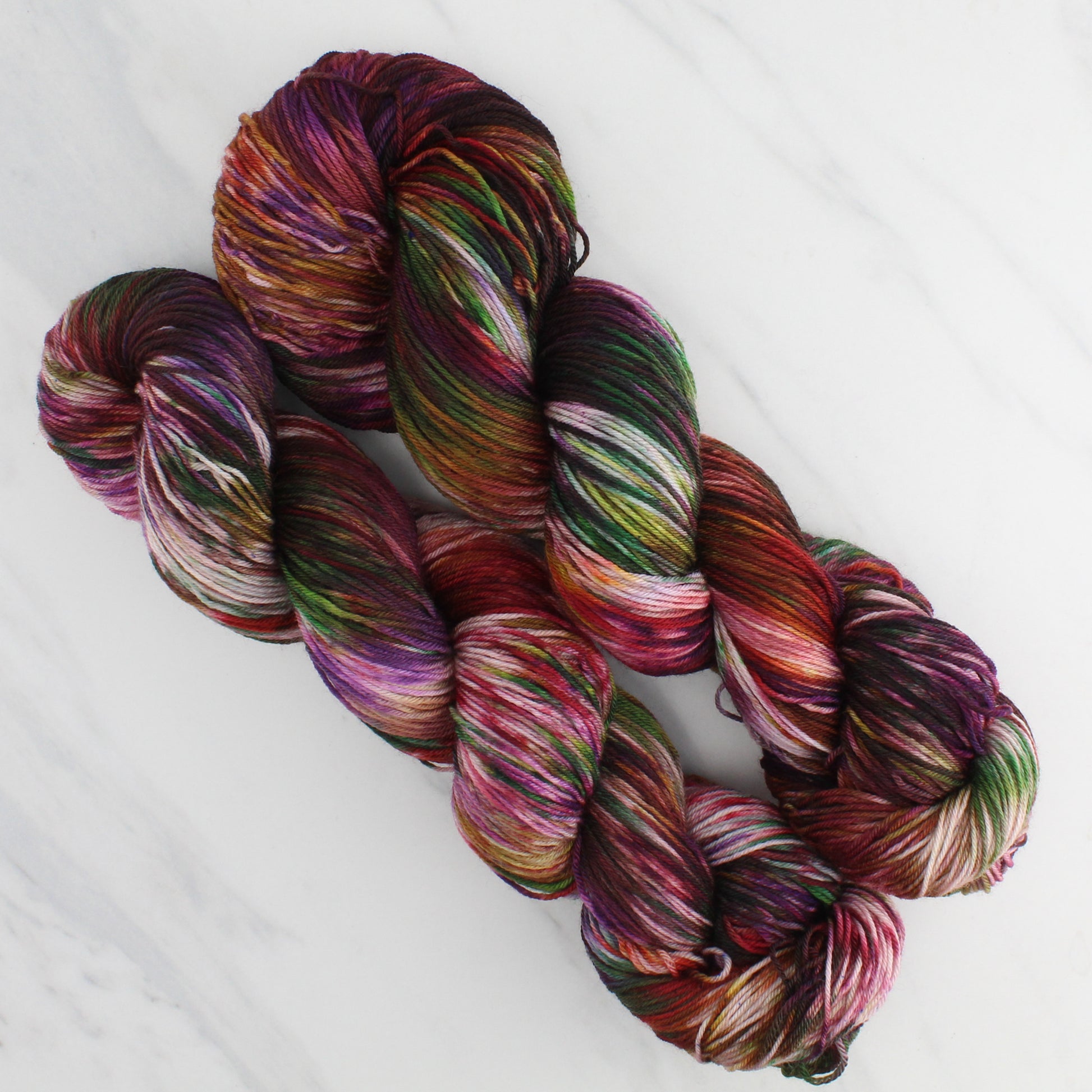 Stained Glass DK (3) - Stained Glass DK is a soft and squishy 2-ply yarn made of 100% superwash merino. Each 100 gram skein has 246 yards. The thing that makes Stained Glass so cool is that one of the two plies is made with black merino wool, so when I dye the yarn, it looks like stained glass. This yarn base would be great for shawls, sweaters, hats, legwarmers, and more. While it is better to hand wash this, it can be machine washed on cold and air dried. Uses: Knit, Crochet, and Weft in Weaving. Great for shawls, sweaters, hats, and more.