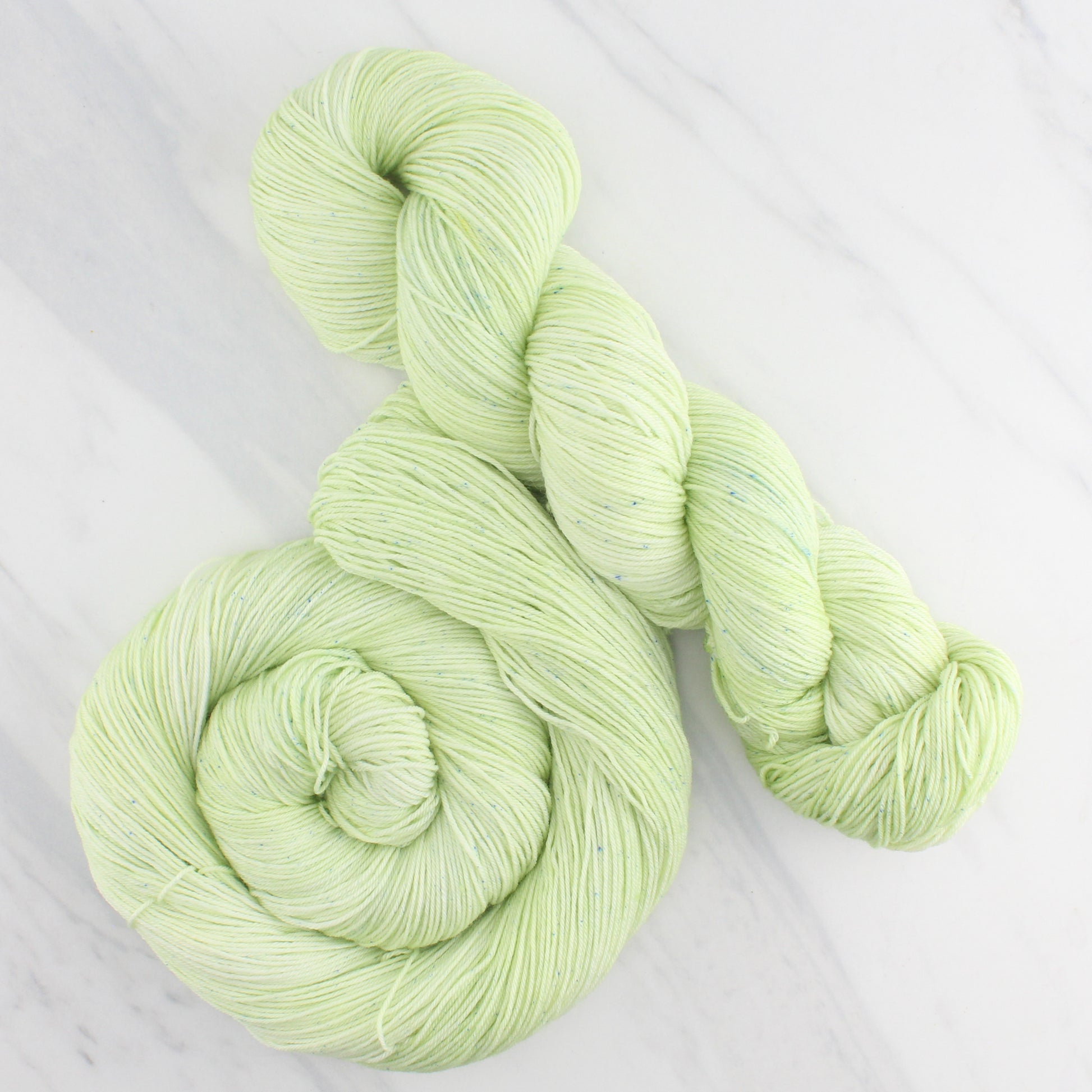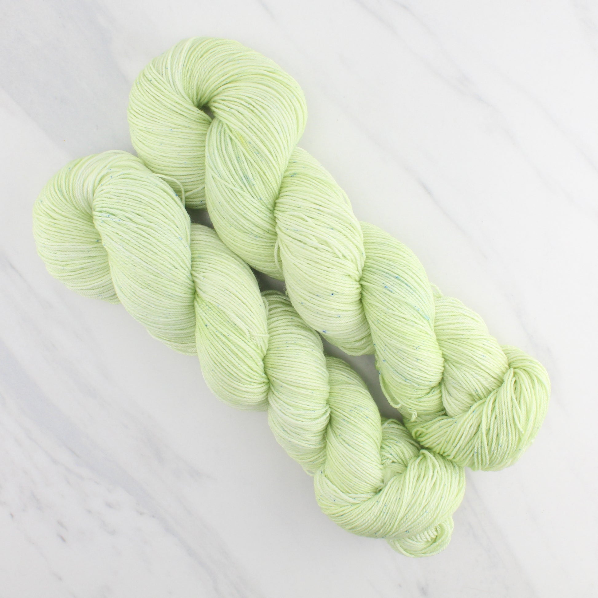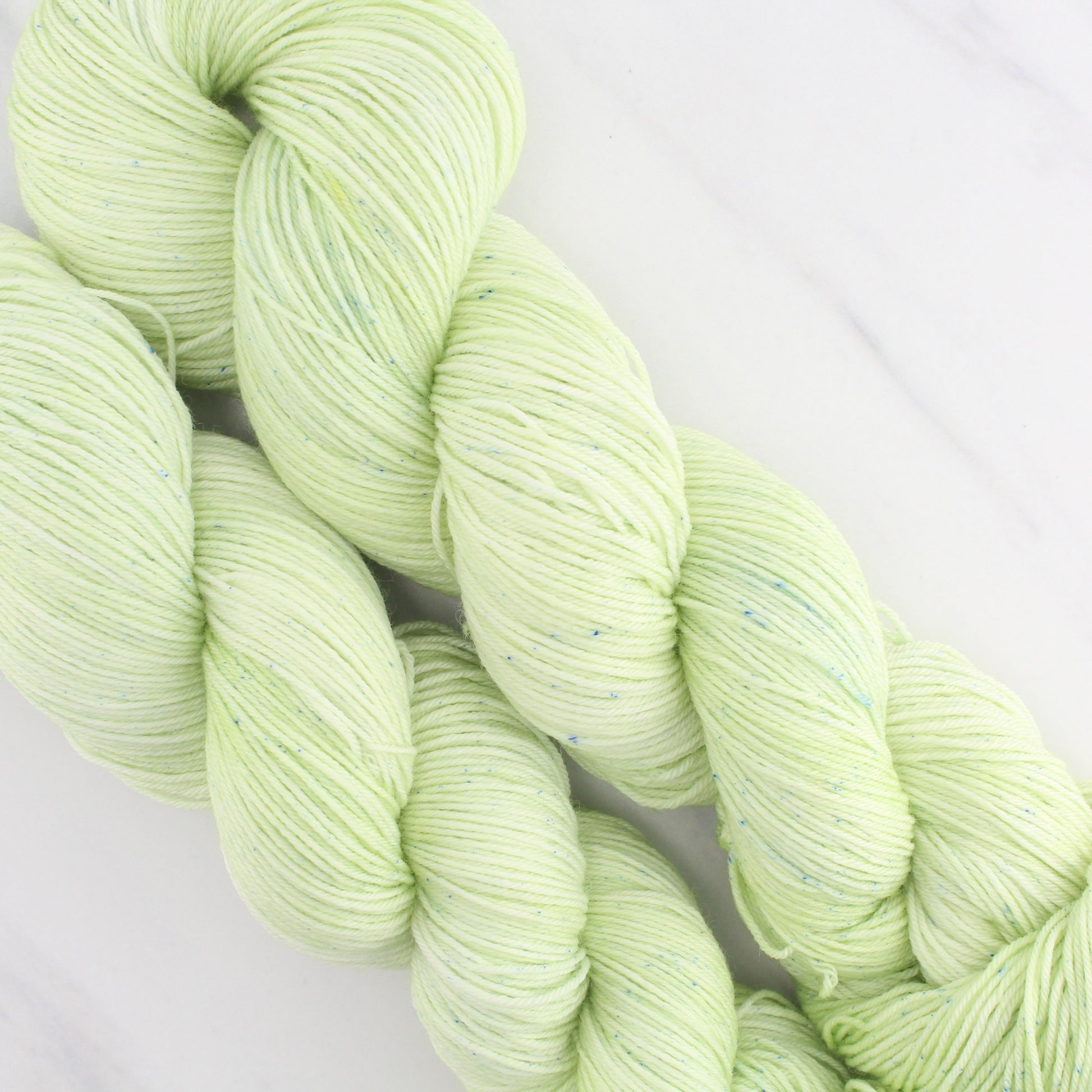 This delicate light green is a semi-solid colorway with subtle blue speckles.