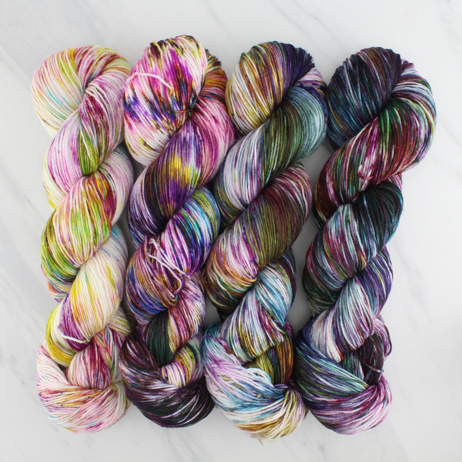 Splashed & Speckled Colorways - These colorways have multiple colors that are placed over the skein in short segments of no more than an inch or two at a time. They often have speckles as well, which are small dots of dye. Because of the varied placement of the dyes, each skein tends to vary more than with other colorway types. Splashed & Speckled colorways are not likely to pool.